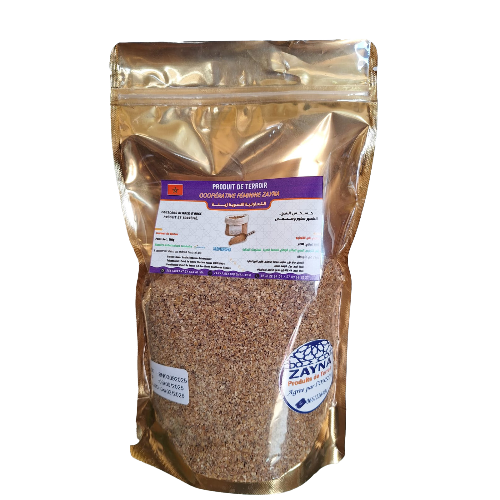 Produit par les femmes de notre coopérative, chaque étape de sa fabrication respecte un savoir-faire ancestral et valorise les richesses du terroir local. Riche en fibres et en nutriments essentiels, le Bendek d’orge est un aliment sain et équilibré, parfait pour ceux qui souhaitent allier plaisir et bien-être.